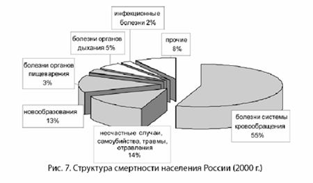 При анализе структуры причин смертности учитывались, приведенные выше данные литературы, по которым возникновение ряда заболеваний сердечно-сосудистой системы, пищеварительной, иммунной систем организма, онкологических болезней, травм и суицидных попыток напрямую или косвенно связано с возникновением у людей психо-эмоционального перенапряжения и стресс-обусловленных последствий в результате воздействия на них социально отягощенной неблагоприятной информации. В соответствии с этим такие причины смерти, как болезни кровообращения, травмы, новообразования, болезни органов пищеварения, самоубийства, были условно отнесены к информационно-зависимым причинам смерти. При анализе данных смертности населения России следует отметить, что смертность за 7 лет 1994—2000 гг. по сравнению с аналогичным семилетним периодом 1987—1993 гг. по среднегодовым показателям увеличилась в среднем на 25,9% (с 11,6 умерших на 1000 населения до 14,6) (рис. 6). При этом на примере 2000 года можно отметить, что информационно-зависимые причины смерти (болезни кровообращения, травмы, новообразования, болезни органов пищеварения, самоубийства) являются причиной, в общей сложности, 1304,8 случаев на 100 тыс. населения из 1535,1 всех случаев смерти (рис. 7), что составляет 85% всех смертей в России. Для сравнения — по данным ВОЗ (http://www.who.ru/) в структуре смертности населения экономически развитых стран (статистический учет несколько отличается от российского) информационно-зависимые причины смерти так же преобладают и составляют 71% всех смертей (рис. 8). ![]() При сравнительном анализе распространенности и динамики статистических показателей самоубийств в России и за рубежом следует отметить, что в России их было совершено в 2000 году 56,6 тыс., по данным ВОЗ во всей Европе самоубийств совершается ежегодно всего 100 тыс. К вопросу информационно-зависимой этиологии самоубийств следует отметить, что при проведенном (Б.А. Войцехович, 1996) анализе значения различных факторов, сыгравших решающую роль в 30-ти тыс. случаев самоубийств, доказано, что наибольшую нагрузку несет фактор психофизического состояния — 42% детерминации, менее — другие факторы: семейный — 13%, суицидального анамнеза — 10%, одиночества — 8%. В начале века Россия была в числе стран с невысоким уровнем завершенных самоубийств, который составлял в России в 1923—1926 гг. — 5,6 самоубийства на 100 тыс. чел, В то время как в 1921—1925 гг. уровень завершенных самоубийств составлял в Англии — 9,4, Венгрии — 27,9, Германии — 22,3, Франции — 19,5, Швейцарии — 23,5 (Я. Гилинский, 1998). Таблица 1. Число самоубийств в России